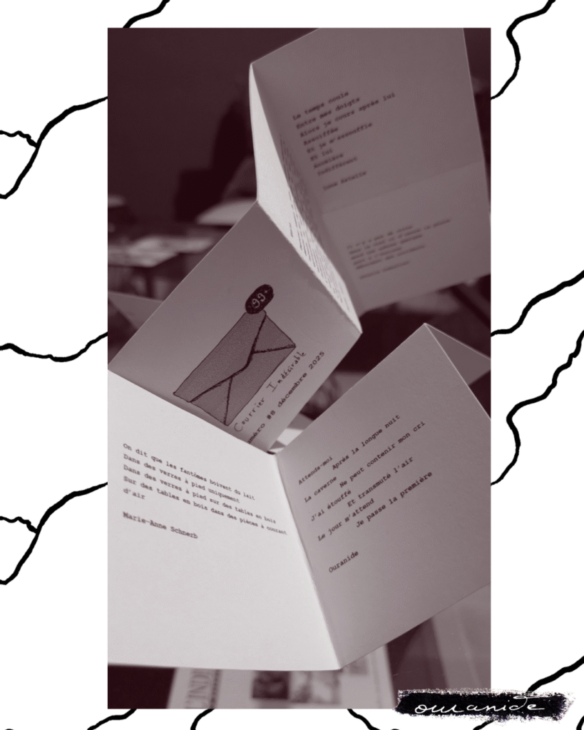 I’ve also had the opportunity to get one of my poem published in the December issue of Courrier indésirable, created by Jérémy Semet. The concept is simple: poems are printed on a single sheet then folded to become a small literary object. It’s like opening a gift, really. I’m happy to be part of all the poets published in this audacious project.